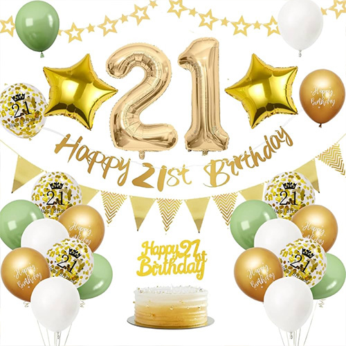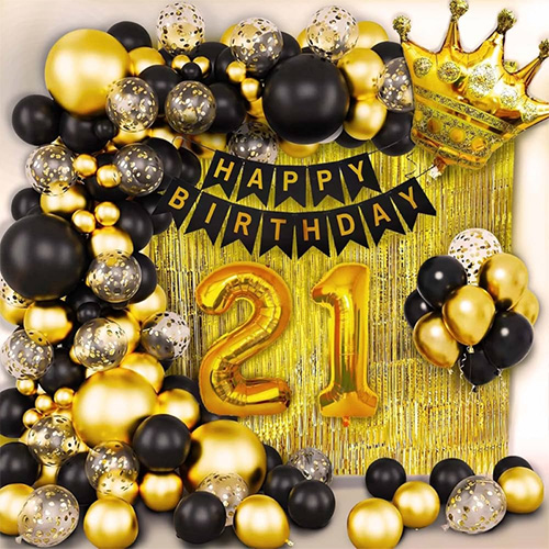 21-ci şar çələng tağ dəsti: Bu 21-ci şar çələng tağ dəsti əsas rəngləri qara, qızılı, gümüşü və s.dir ki, bu da 21-ci ad günü partiyasında kişi və qadın dekorasiyası üçün çox uyğundur. Onlar qapıya və ya divara asıla bilər, həm də kişilər və qadınlar üçün unikal 21-ci ad günü partiyası yaratmaq üçün qapalı və açıq istifadə üçün çox uyğundur.