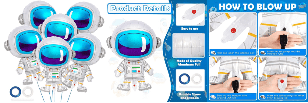Unikal kosmik mövzu atributlarına malik, yüksək dərəcədə çevikliyə malik astronavt folqa şarı, istər astronavt folqa şarı kiçik dəstini yaratmaq, istərsə də astronavt folqa şarı çələngini yaratmaq üçün asanlıqla idarə edilə bilər.