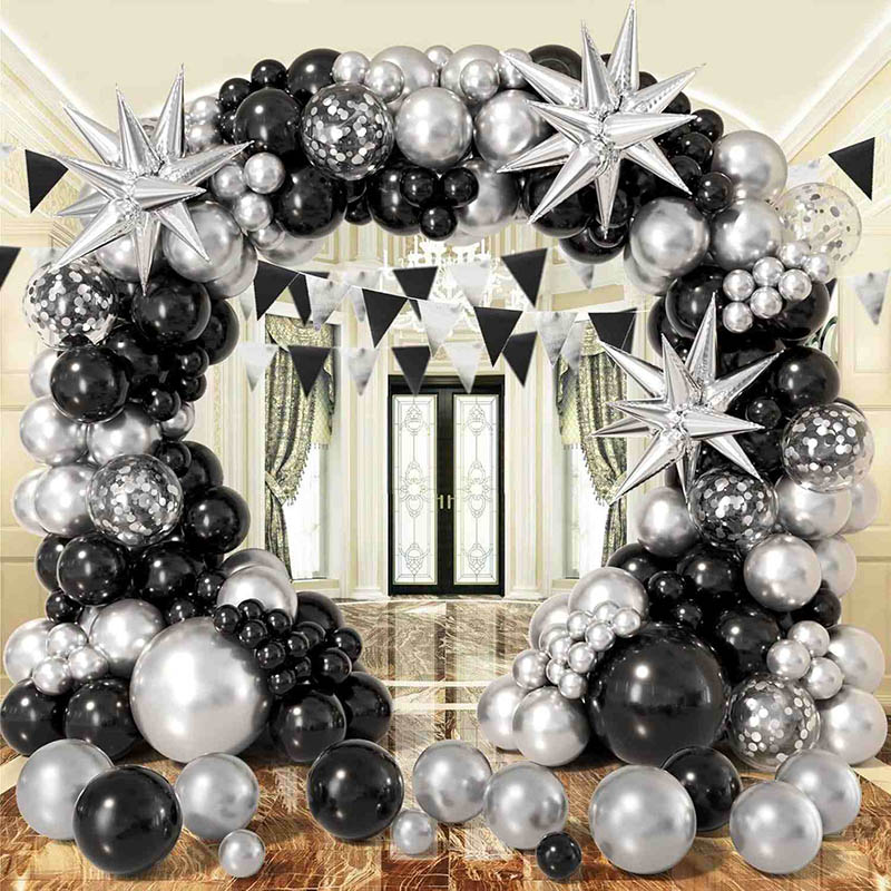 Qara və gümüş birlikdə sirli bir hiss və müasir bir görünüş var. Qara güc və dərinlik üçün dayanır. Gümüş saflıq və irəlidə olan şey deməkdir. Bu iki rəng aydın bir kontrast etmək üçün qoşulur. Onlar çaşqın deyil, həm də tərzi və varlığı var. Bunlar toy, marka hadisələri və ya ad günü partiyaları üçün uygundur. Qara və Gümüş Balon Garland, ləkəli və zərif əhval-ruhiyyə əlavə edir. Məkanı daha gözəl hiss edir və yaxşı zövqə malikdir.