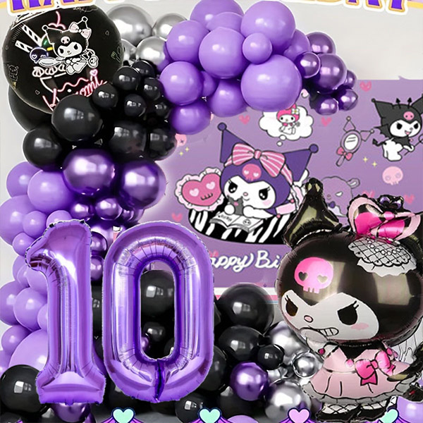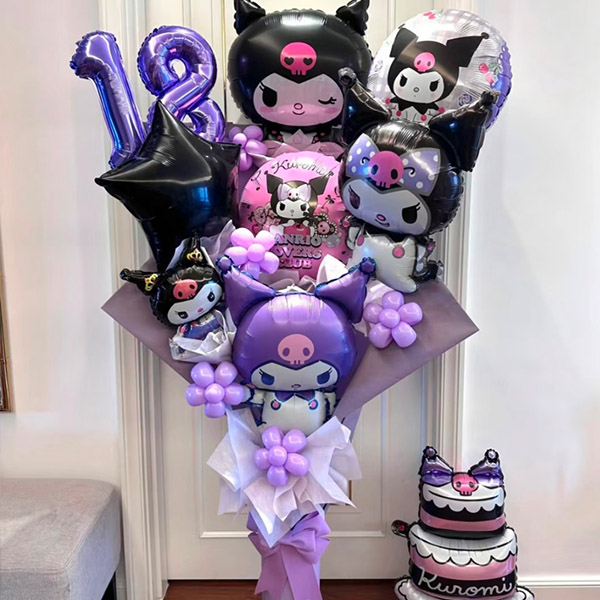 Kuromi, qara hicablı bir dovşan və alnında çəhrayı kəllə loqotipi olan bir dovşan əsasında bir cizgi filmidir. Bütün dünyada uşaqlar tərəfindən sevilir. Bu cizgi filmi kuromi folqa balonu dəsti Kuromi'nin klassik rəngləri ilə sirli və sevimli bir atmosfer yaradan qara, bənövşəyi və çəhrayı istifadə edir. Kitdə cizgi filmi Kuromi'nin ən böyük baş şarnası, 18 düymlük ulduz folor balonu və kuromi naxışlı 18 düymlük dəyirmi folqa balonu da daxil olmaqla müxtəlif formalı folqa balonları var. Bu paketlər dəsti kiçik və incə, kiçik uşaq doğum günü partiyaları üçün uyğundur, Kulomi mövzusu ad günü partiyaları, yalnız görkəmli vizual effektlər, eyni zamanda yaxşı rahatlıq və davamlılığı, zərər verə bilməz.