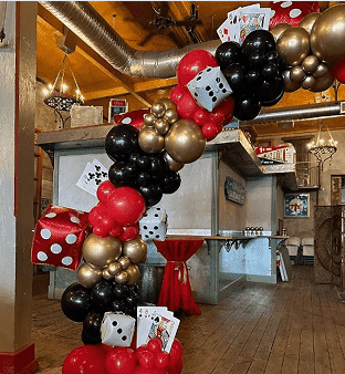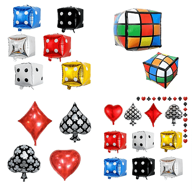 Casino balonu çələng dəstinə əsasən lateks balonları daxildir, onlar müxtəlif ölçülərdə olurlar (5 düym, 10 düym, 12 düym və 18 düym). Onların rənglərində adətən qırmızı, qara, qızılı və s. üstünlük təşkil edir. Dəstin laylı effektini artırmaq üçün siz şəffaf lateks şarları və konfeti lateks şarlarını da görə bilərsiniz. Dəstin mövzusu kimi kazino mövzulu folqa balonları da əvəzolunmazdır.