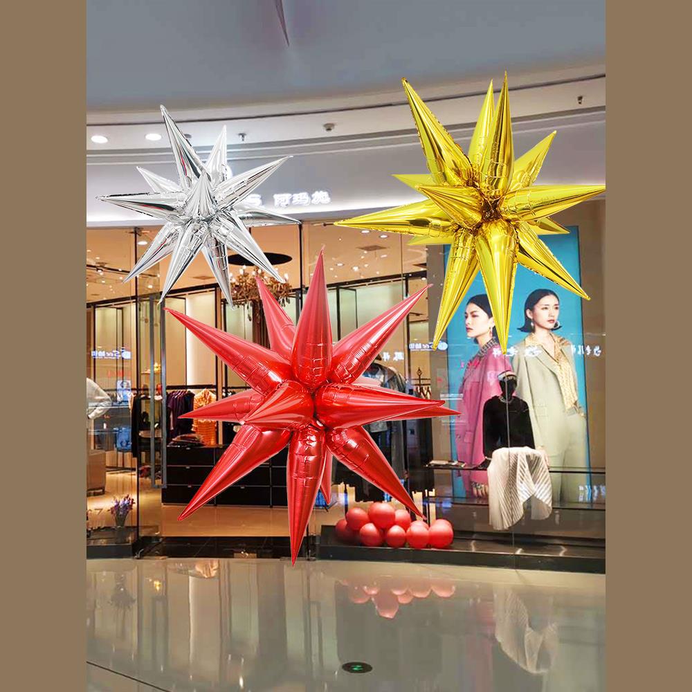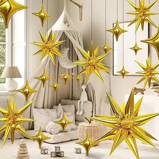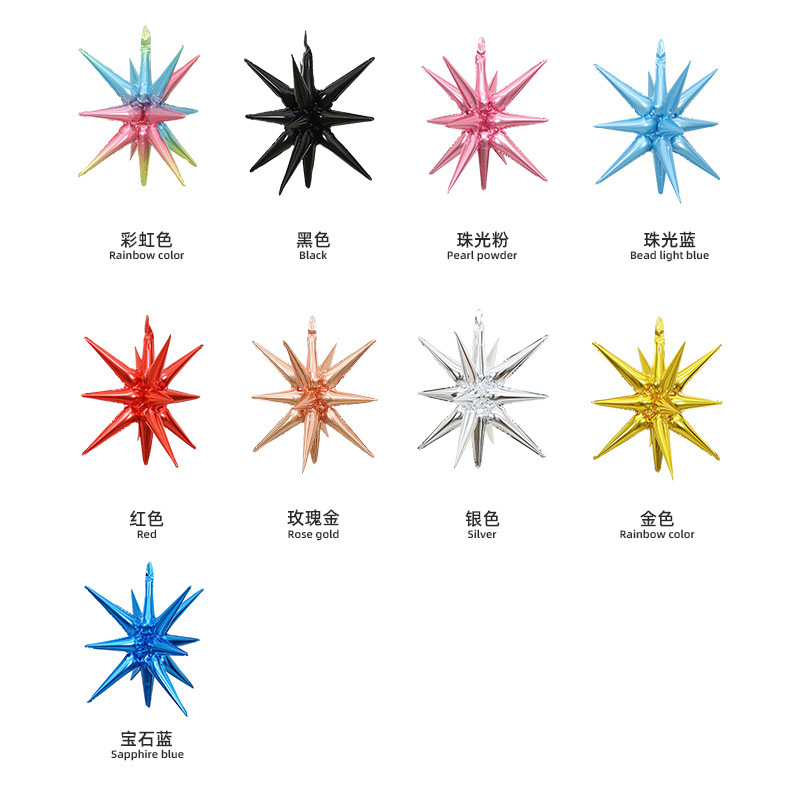 Bir parça partlayan ulduz folqa balonları: iki ölçüdə mövcuddur: 22 düym və 27 düym. 22 düymlük ölçüsü daha kiçik və yataq otağı və ofislər üçün uyğundur, doğum günü dekorasiyası üçün mükəmməl hala gətirir. 27 düymlük, ziyafət salonu və ticarət mərkəzləri kimi daha böyük boşluqlar üçün daha uyğundur. Yüksək asılsa da, naxış aydın görünə bilər.