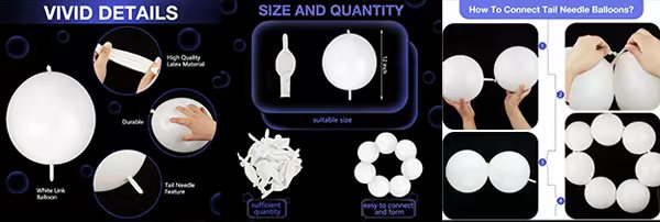 Bu lateks quyruq balonları, balon zəncirləri, balon torları, balon fonları və balon tağları yaratmaq üçün, onları məzun partiyalarına, ildönümləri və digər qeydlərə mükəmməl bir əlavə etmək üçün geniş istifadə olunur. Moda quyruqlu balonları çevik və təhlükəsizdir, əksər insanlar üçün uyğundur. Sürətli bağlantı şarlarımız, alətlərə olan ehtiyacı aradan qaldıraraq unikal bitmə-son dizaynları ilə fərqlənir. Ənənəvi şarlar ilə müqayisədə, link balon prosesi daha sadə və daha sürətli, partiyanızı və ya hadisə məkanını daha səmərəli bəzəməyə imkan verir.