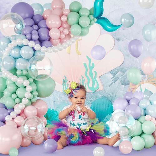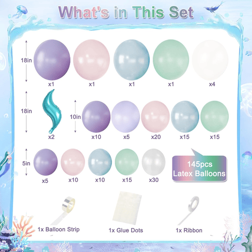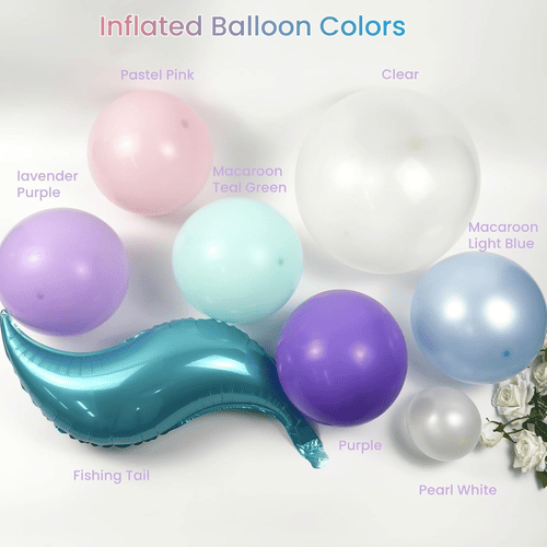 Su pərisi şar çələngindəki şarlar bənövşəyi, lavanda, pastel çəhrayı, açıq mavi, çay yaşılı, mirvari ağ və şəffaf kimi müxtəlif rənglərlə, həmçinin folqa su pərisi quyruğu bəzəkləri ilə gəlir və bu, sehrli su pərisi okean temalı partiya yaratmaq üçün əladır.