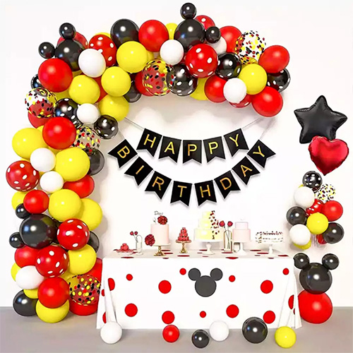 BuMickey Mouse şar çələng qövsüdaxil olmaqla, əsasən çəhrayı və qırmızı seriyalarda mövcuddurlateks balonları, folqa balonları, ad günü kağız bannerlər, folqa pərdələr və digər aksesuarlar. Bu paketin bütün aksesuarları keyfiyyətlidir.