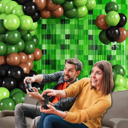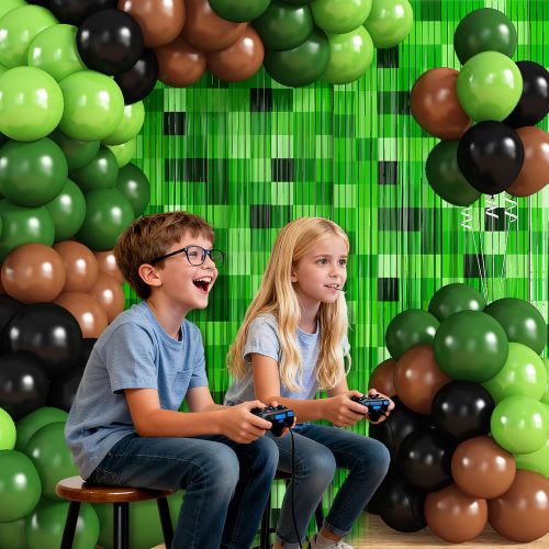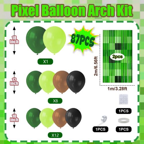 Minecraft video oyunlarından ilhamlanan bu davamlı minecraft şar qövsü dəsti klassik macəra oyunlarının cazibəsini çəkən oynaq laylı görünüş yaratmaq üçün yaşıl piksel şarların müxtəlif çalarlarını Minecraft temalı ziyafət fonları ilə birləşdirir.