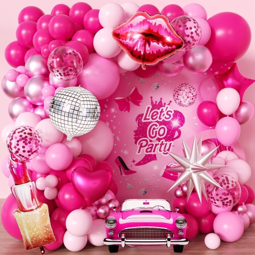 Dəstlərə 5 düym və 12 düymlük tutqun çəhrayı lateks şarlar, 5 düym və 12 düymlük mirvari çəhrayı lateks şarlar, 5 düymlük və 12 düymlük metal çəhrayı lateks şarlar, 5 düym və 12 düymlük ağ lateks şarlar, 12 düymlük çəhrayı konfeti lateks şarları, 18 düymlük çəhrayı rəngli lateks şarlar, 18 düymlük ağ rəngli şarlar daxildir. folqa şarları, çəhrayı folqa pərdəsi, çəhrayı Ad günün mübarək folqa şarları, kəpənəklər bəzəkləri və yapışqan nöqtələr, şarlar şeridi və lent kimi aksesuarlar.