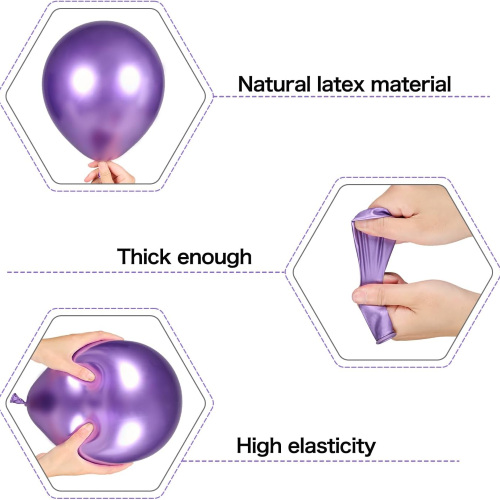 Bənövşəyi və qara rəngli şarlarımız təbii lateksdən hazırlanır. Şişirildikdən sonra şarlar dolğun, dolğun bir forma malikdir və onları partlatmaq asan deyil. Onlar parlaq və canlı rənglərə malikdirlər. Balonlarımız EN71, CPC və CE kimi testlərdən keçib. Təhlükəsiz və zəhərsizdirlər, bu da onları uşaqların oynaması üçün uyğun edir. Onlar müxtəlif ölkələrdə satıla bilər.