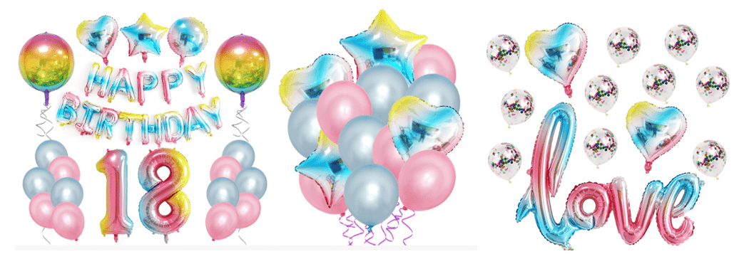 Rəng aspekti: Gradist Blooming, Rəng Dikişləri, Rəngli Dikiş, Rainbow zolaqları və digər prosesləri, zəngin rəng effektlərini göstərən digər proseslərdən istifadə edərək folqa balonu. Bəzi məhsullar qırmızı, narıncı, sarı, yaşıl, mavi, indigo və bənövşəyi yeddi əsas rəngə əsaslanır. Təbii keçidin tədricən dəyişdirilməsi texnologiyası ilə yağışdan sonra göy qurşağı kimi şəffaf bir toxuma yaradırlar. Bəzi məhsullar, güclü bir vizual təsir yaratmaq və partiyanın atmosferini işıqlandıran, sarı və mavi parçalanma, sarı və yaşıl əks-selik kimi yüksək doyma ilə rəng toqquşması ilə rəng toqquşması istifadə edir. Bu rəng dizaynı, göy qurşağı tərəfindən simvolizə edilmiş xalqın psixoloji və şansın psixoloji birliyinə uyğundur və fərqli mövzular olan partiya üslublarına da uyğunlaşdırıla bilər.