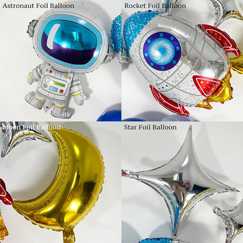 Folqa balonlarında astronavtlar, raketlər, uçan boşqablar və digər üslublar var ki, bu da bu çələngə böyük maraq və reallıq əlavə edir.