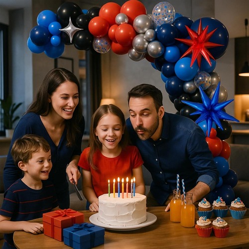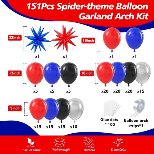 Balon dəstinin əsas rəngləri mavi, qırmızı və qaradır. Fərqli üç rəng sizi filmdəki Hörümçək-adam obrazını təsəvvür etməyə vadar edəcək. Bu dəstdə tutqun qırmızı şar, tutqun mavi şar, tutqun qara şar, metal zolaqdan hazırlanmış şar daxil olmaqla lateks şarlar. Bu dəstdəki folqa şarı partlama ulduzlu folqa şarıdır, rəngi mavi və qırmızıdır.