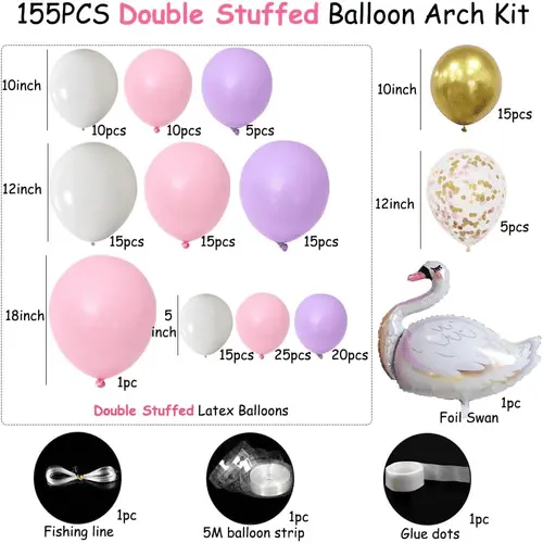 Biz Swan balonu qövsü üçün müxtəlif aksesuarlar əlavə edəcəyik. O cümlədən nöqtə yapışqan, şar zolağı və lent. Bundan əlavə, istədiyiniz kimi digər aksesuarları da əlavə edə bilərik.