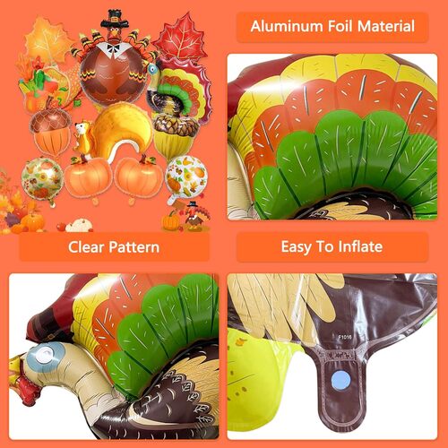 Şükran günü folqa şarları yüksək keyfiyyətli xammaldan (AL-PA-PE kompozit film) hazırlanır, beləliklə, şarlar daha uzun müddət davam edə və səthi parlaq saxlaya bilər. Onların bir çox üstünlükləri var. Onlar hava və heliumu yaxşı saxlaya bilirlər, sızması asan deyil. Kenarlar yaxşı işlənmişdir, buna görə kəskin təhlükə yoxdur. Balonların keyfiyyəti güclü olduğu üçün yaxşı saxlandıqdan sonra onları bir dəfədən çox istifadə edə bilərsiniz. NiuN®-də bütün folqa balonları partiyalar üçün ən yaxşı seçiminiz olacaq.