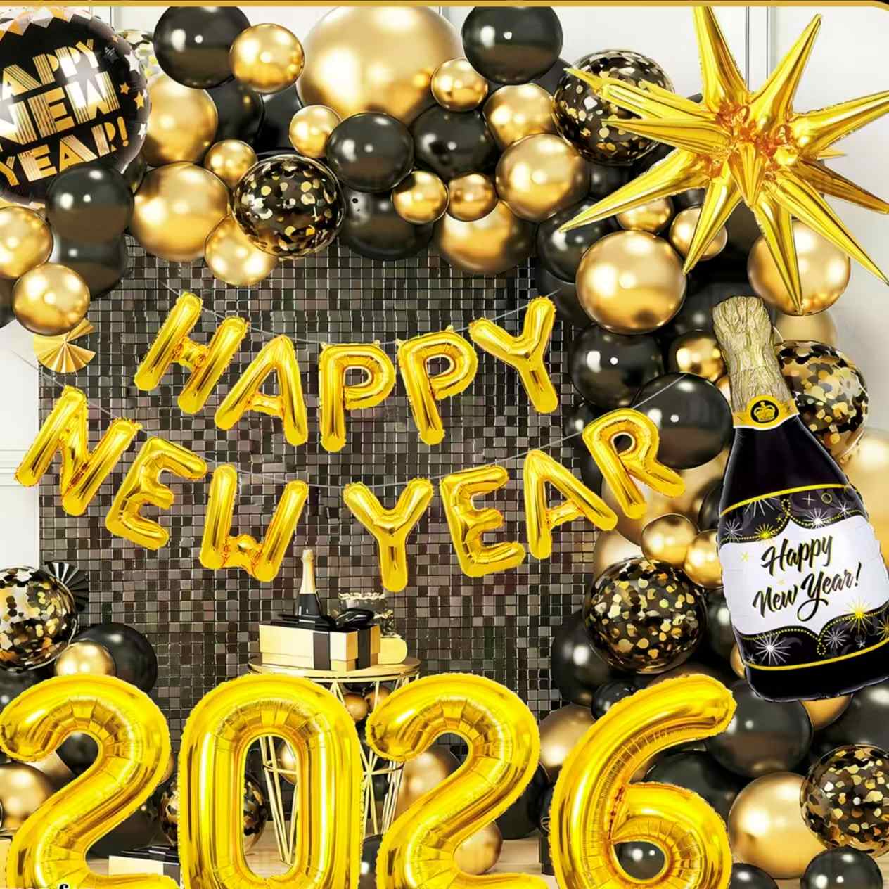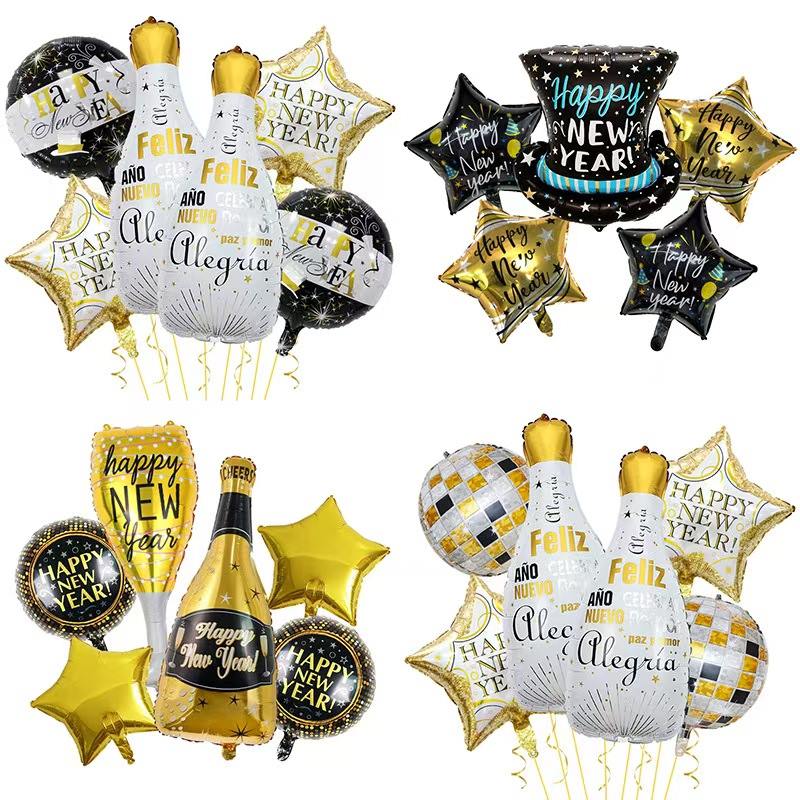 Yeni il temalı dəsti haqqında düşünün. Şampan şüşələri kimi görünən folqa balonları var. Buraya "2026" nömrəsi şarları, ulduz dekorativ şarlar və daha çox şey daxildir. Əsas rənglər qara-qızıl və ya qızıl-ağdır. Yeni il şənliyi ilə doludur. Asanlıqla lüks və təntənəli Yeni il ziyafəti səhnəsi edə bilər.